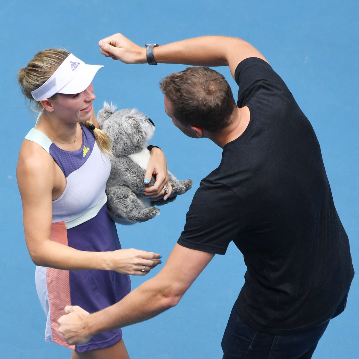 Main photo:- Melbourne Park Australia Caroline Wozniacki plays her “last match” on the WTA tour losing third round match with a hug from husband David Lee – Roger Parker International Sports Fotos Ltd