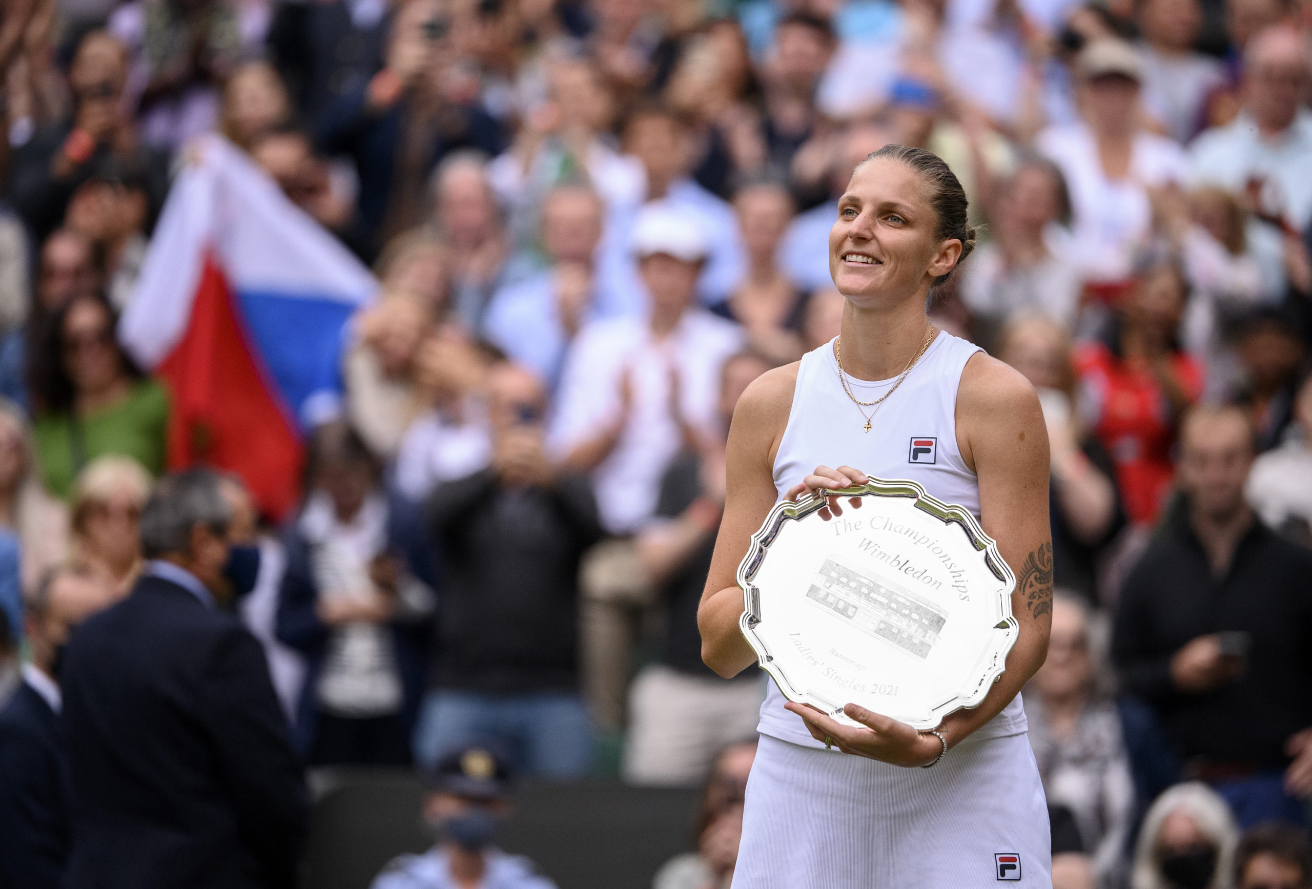 Karolina Pliskova (CZE) holds the runner up plate after being defeated by Ashleigh Barty (AUS) in the final of the Ladies' Singles on Centre Court at The Championships 2021. Held at The All England Lawn Tennis Club, Wimbledon. Day 12 Saturday 10/07/2021. Credit: AELTC/Ben Solomon