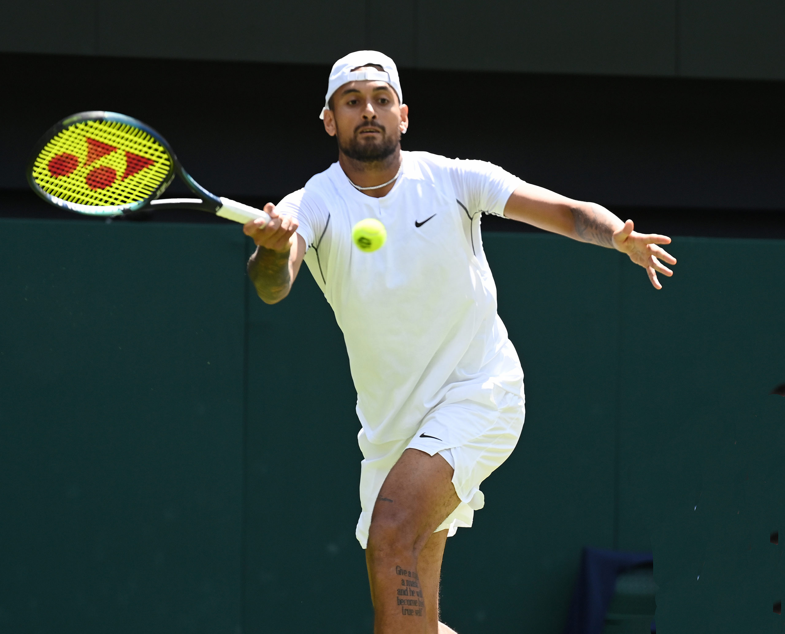 London Wimbledon Championships Day 04/07/2022 NICK KYRIGOS (AUS) fourth round match on centre court displays his motto on a newtattoo “Give a man a mask and he will become his true self” (Oscar Wilde) Roger Parker International Sports Fotos Ltd